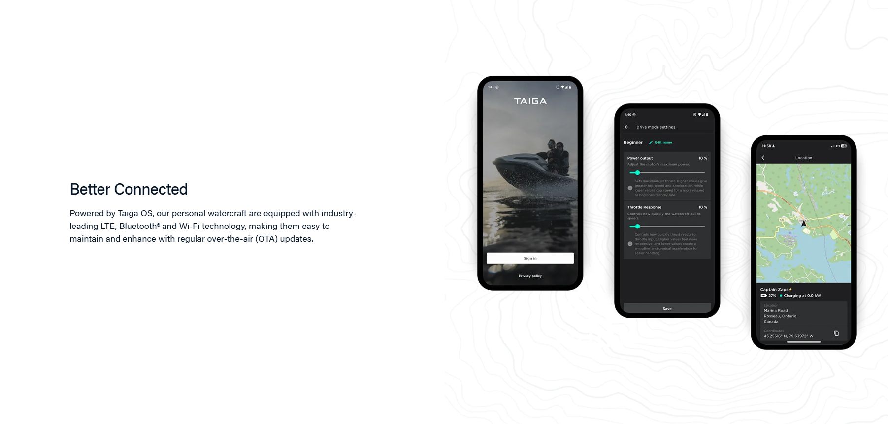 Maintenance Free! Unlike gas-powered engines that require oil, belts, spark plugs and mechanical know-how to operate and maintain, Taiga’s electric watercraft need very little maintenance. And some servicing can often be done through a simple software update.​